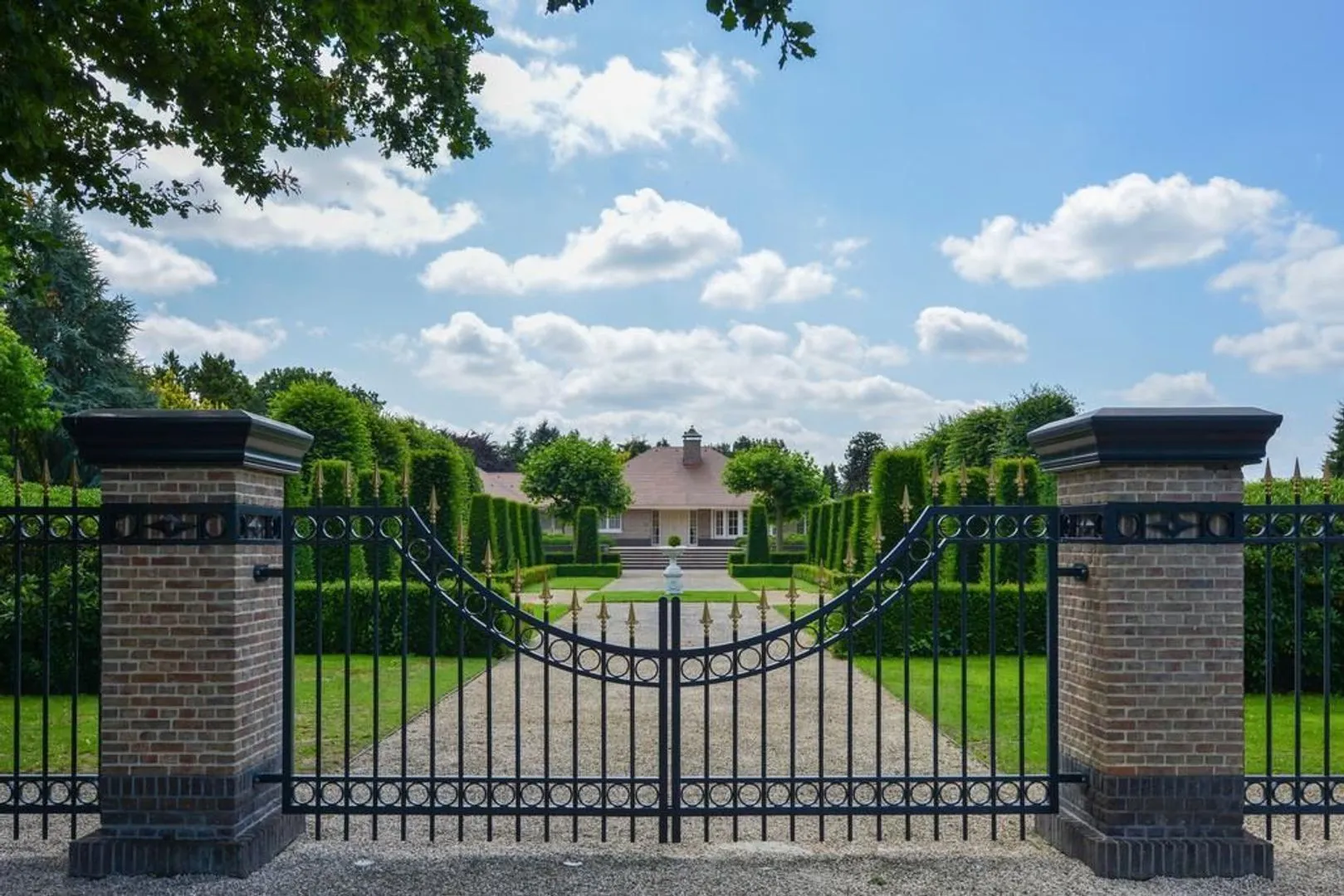 Het masjestueuze gevoel begint zodra de elektrisch bedienbare toegangspoort opent. De fraaie oprijlaan met in het midden een prachtige waterpartij met fontein wijst de weg naar de luxe villa.