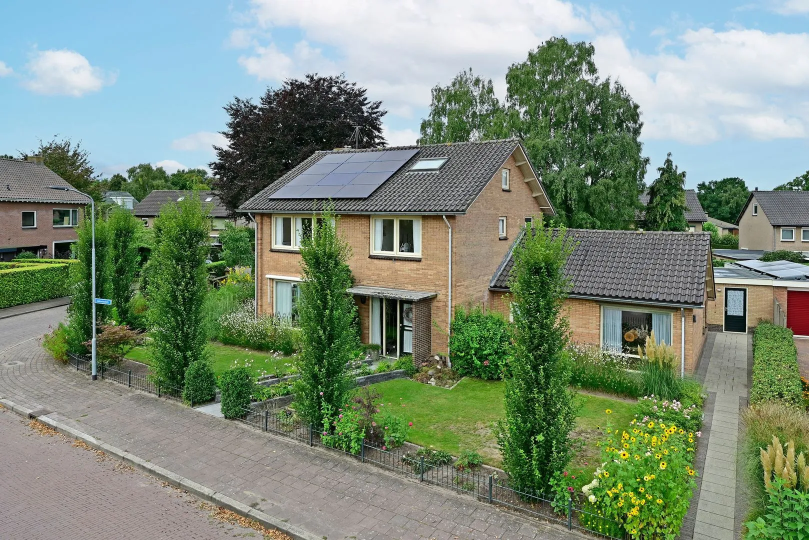 Het fraaie hoekperceel van 770 m² is rondom gelegen en biedt voldoende privacy en heerlijke terrassen om in zon of schaduw te ontspannen. Via de Arnt Venlostraat is de carport bereikbaar. Tevens is hier ruimte om meerdere voertuigen op eigen terrein te parkeren.