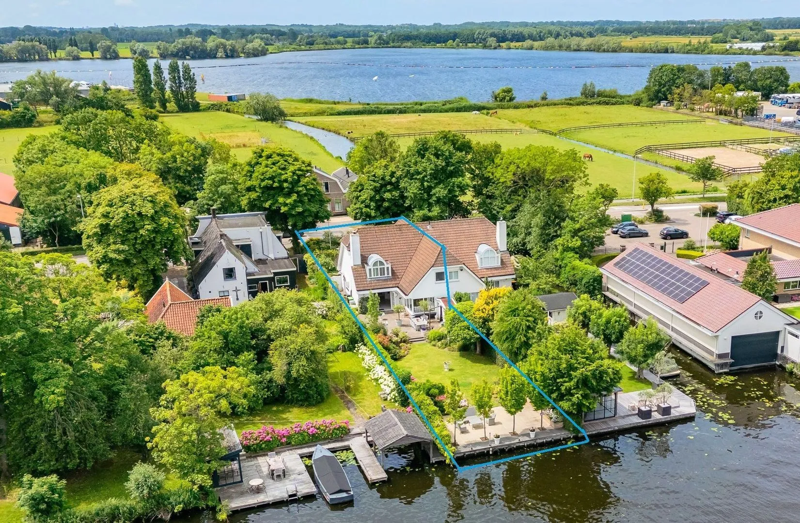 The beautifully landscaped, sunny backyard borders directly on water of the Old Rhine and features a shed and a private jetty. In the front yard is a cozy terrace. In the afternoon and evening you can relax in the sun. The entire garden is equipped with a sprinkler system. In the front garden is parking for three cars on site.