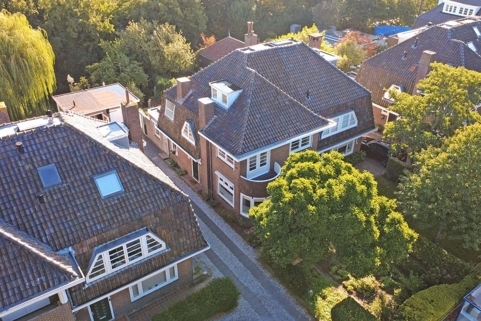 Het perceel is bereikbaar via een lange gedeelde oprijlaan die leidt naar de garage. In de voortuin staat een prachtige volwassen magnoliaboom en ook in de achtertuin zijn diverse fraaie groenpartijen aanwezig.