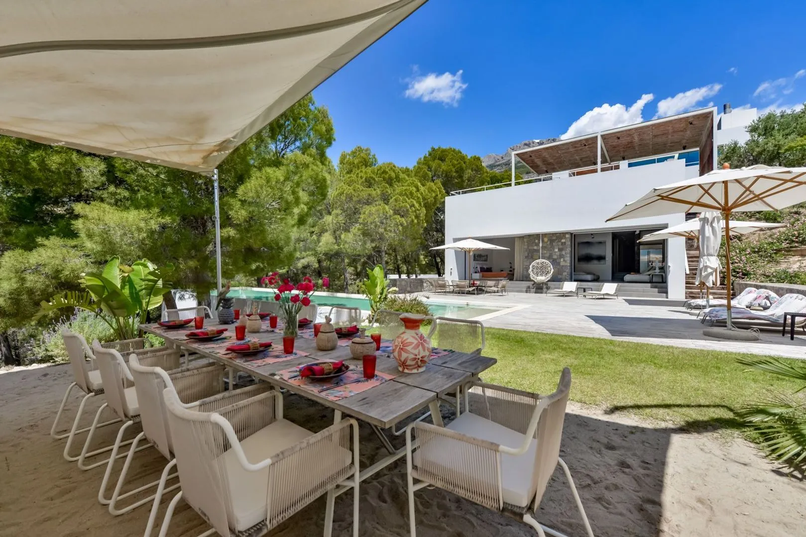 Drie prachtige slaapkamers met eigen badkamer met badkamers die uitkomen op de tuin en directe toegang tot het zwembad van 17 x 3 meter. Verder heeft het een fitnessruimte, sauna, turks bad en een buitenzwembadbar met schaduwrijk terras.
