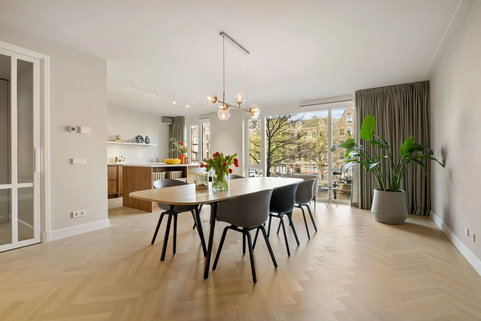 Het kookeiland beschikt over extra bergruimte en een verlengd werkblad dat uitnodigt om gezellig aan de bar te zitten. De eettafel, eveneens aan de voorzijde gesitueerd, biedt een prachtig en vrij uitzicht over de gracht.