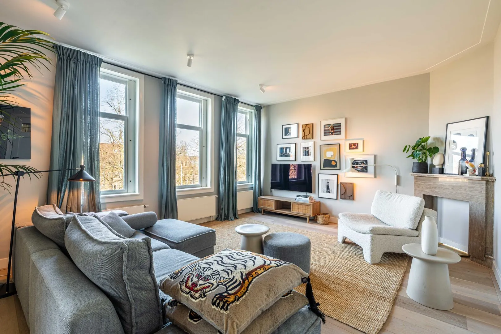 Via de eigen voordeur en opgang bereikt u de entree op de derde verdieping. De ruime hal geeft toegang tot de royale living: een lichte, brede woonkamer met grote raampartijen, hoge plafonds en een prachtig uitzicht over de groene laan. Het appartement kent een dubbele breedte waardoor er veel licht naar binnen komt. De ruimtes zijn af te sluiten middels een originele en-suite. Aan de achterzijde bevindt zich de zeer ruime eetkeuken, eveneens voorzien van veel lichtinval, een grote eettafel en openslaande deuren naar het gevelbreedte balkon op het Zuiden. Dit is een heerlijke plek om tot rust te komen, van het licht te genieten of uitgebreid te dineren.