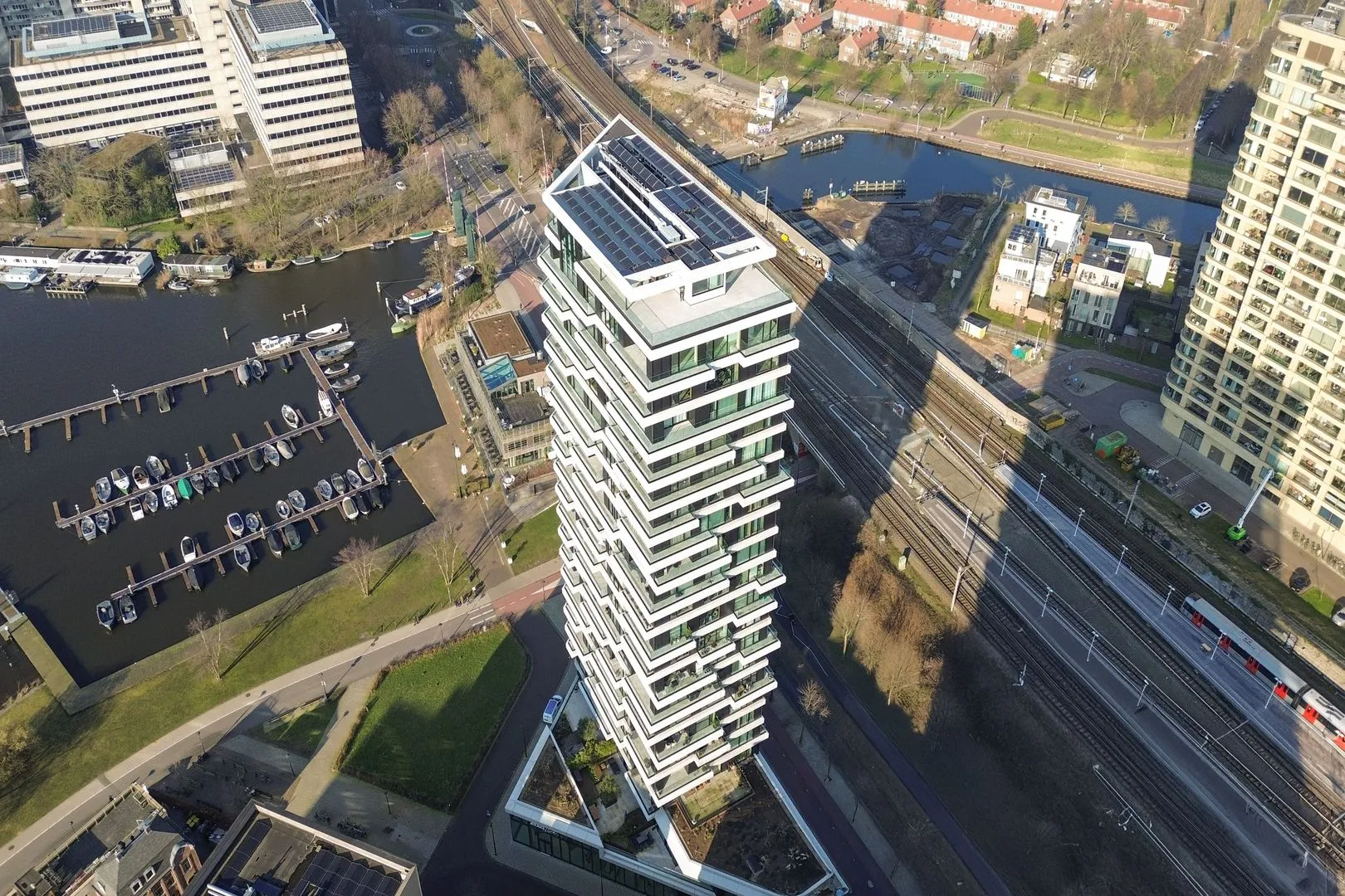 Een penthouse zoals deze, daar vindt u geen tweede van in Amsterdam. De ligging is als een droomscenario voor de liefhebbers van water: HAUT staat namelijk aan de voet van de Amstel. Enorme raampartijen die reiken van vloer tot plafond bieden een waanzinnig panoramisch uitzicht, en voeden het gevoel alsof u in New York City of de Côte d’Azur bent beland. Naar overeenkomsten hoeft u niet te zoeken: dobberende bootjes in de stadshaven, picknickende bewoners op Park Somerlust en fijnproevers die bij naastgelegen restaurants de smaak van Zuid-Europa willen ervaren of voor een verrassende bite naar George Marine uitwijken en van daaruit genieten van de zonsondergang; zie het allemaal van een afstand gebeuren. Of neem er actief deel aan. De uniek hoge ligging van het penthouse draagt bij aan het gevoel dat de top is bereikt. En tegelijkertijd is een duik in de Amsterdamse wateren laagdrempeliger dan ooit. Sla een handdoek om en strijk beneden neer over het grasveld aan het water dat bij u recht voor de deur ligt. Of blijf u boven verbazen over de mogelijkheid daartoe. Immers, geen betere plek om te dagdromen dan op de bovenste etage van HAUT!