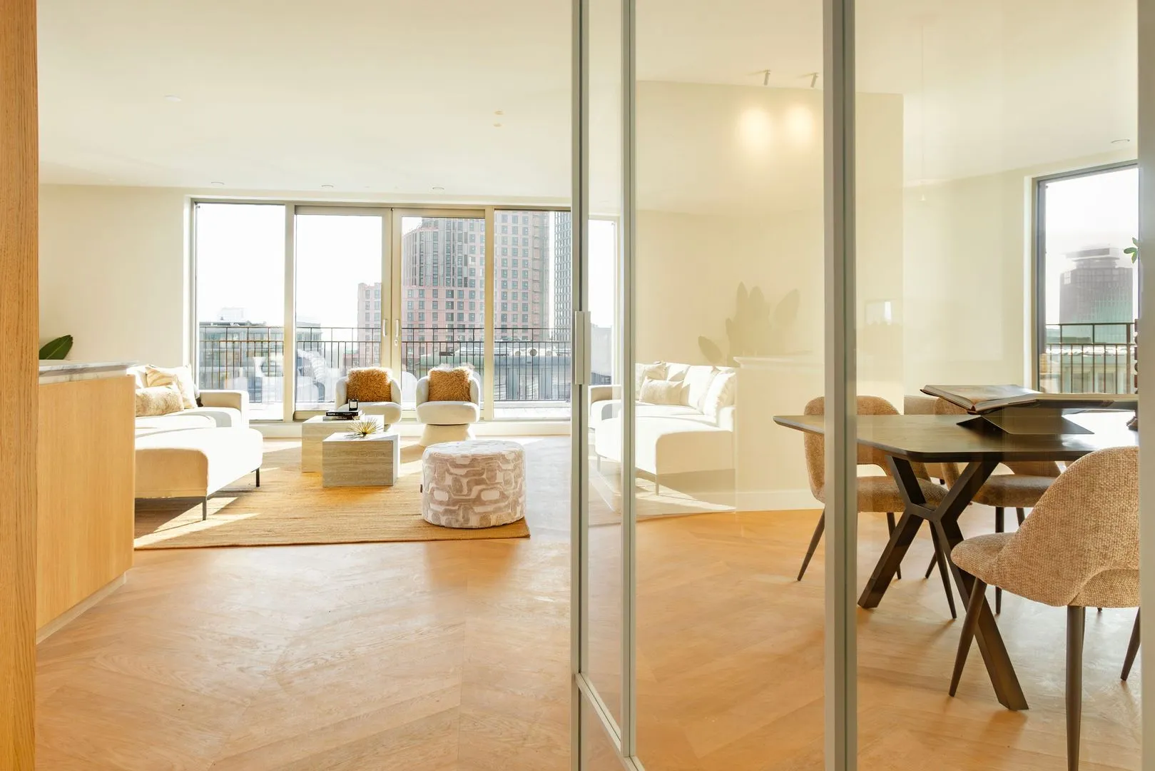 Het interieur is volledig ontworpen door een interieurarchitect en tot in detail uitgevoerd. De royale living vormt het hart van het appartement en wordt gekenmerkt door grote glaspartijen, een hoogwaardige afwerking en een uitgebalanceerde indeling. Centraal in de ruimte bevindt zich een op afstand bedienbare bio-ethanol openhaard (van Luxury Fires), die zorgt voor warmte en sfeer.