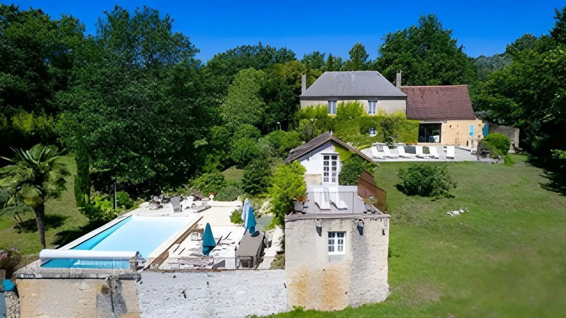 In the heart of the Périgord Noir (Lascaux), on a 2-hectare estate with exceptional views, a charming 150 m² stone manor house offering a harmonious living environment, 3 large furnished terraces and a new outdoor swimming pool (2024), with heating.