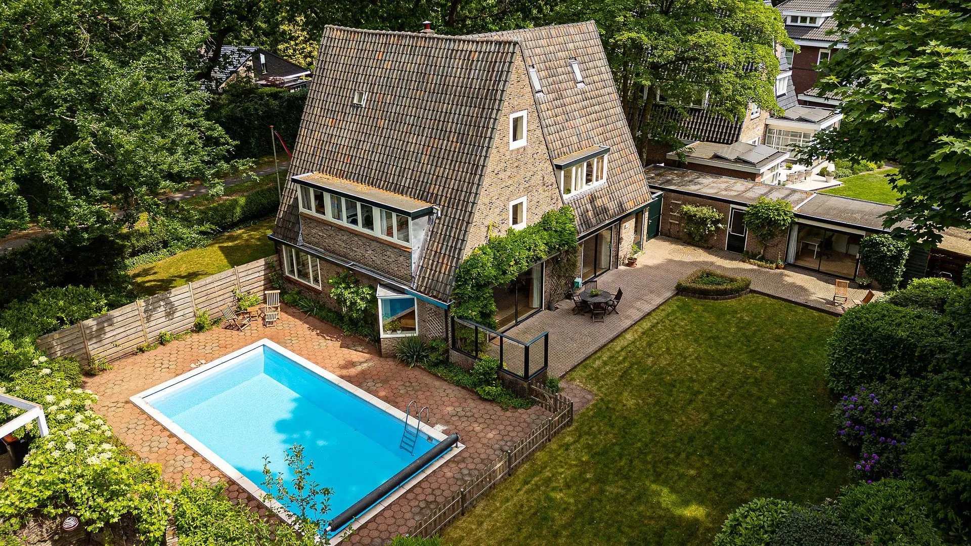 De woning wordt omringd door een volwassen tuin met de zonnige achterzijde op het zuiden. Aan de zijkant bevindt zich een royaal zwembad. De brede oprit biedt parkeergelegenheid voor meerdere auto's op eigen terrein. De garage en het aangrenzende atelier maken de woning uitermate geschikt voor wonen met werk aan huis of het combineren van hobby en gezin.