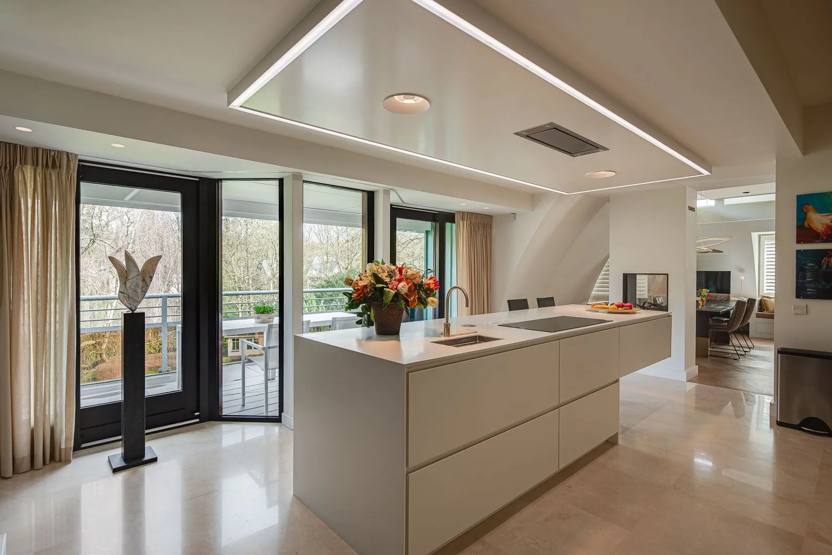 Bij binnenkomst valt direct de rondom doorlopende raamstrook op, net onder plafondniveau, die zorgt voor een prachtige lichtinval en een bijzondere sfeer. De royale daglichttoetreding versterkt het gevoel van ruimte. De afwerking is van uitzonderlijk hoog niveau, met fraaie eiken- en marmeren vloeren, voorzien van vloerverwarming. Verder beschikt het penthouse over een uitgebreid domoticasysteem, airconditioning, een geavanceerde beveiligingsinstallatie en uitstekende geluidsisolatie dankzij ankerloze spouwmuren en zwevende dekvloeren.