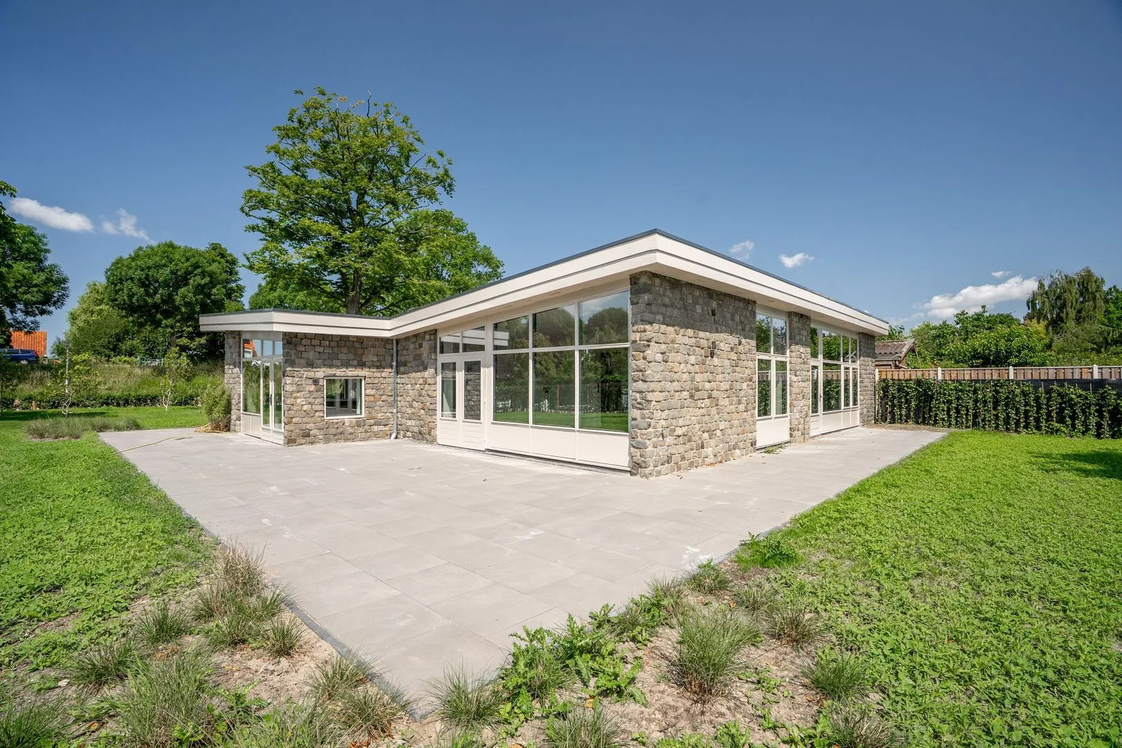 De fraai aangelegde tuin is zonnig gelegen en bestaat uit een combinatie van groen gazon en strakke bestrating – ideaal voor ontspannen, spelen en genieten van het buitenleven.