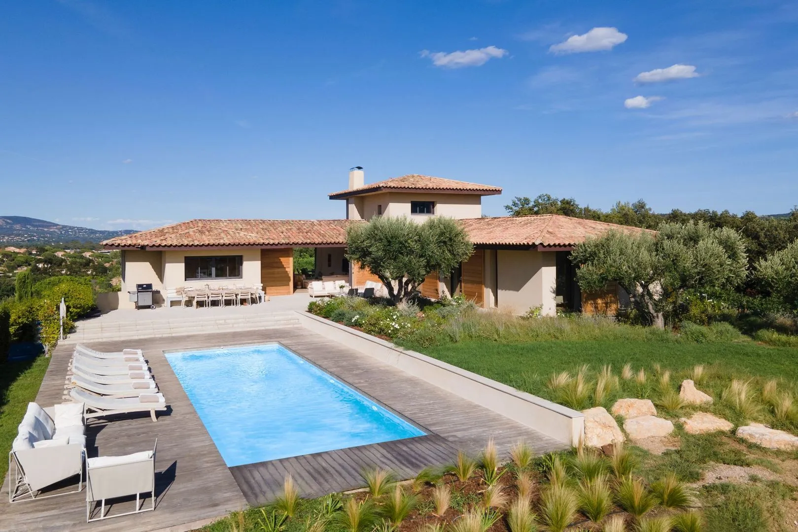 Onder architectuur gebouwde villa met vijf slaapkamers en-suite, gelegen in Cogolin, op 15 minuten van Saint Tropez en de stranden.