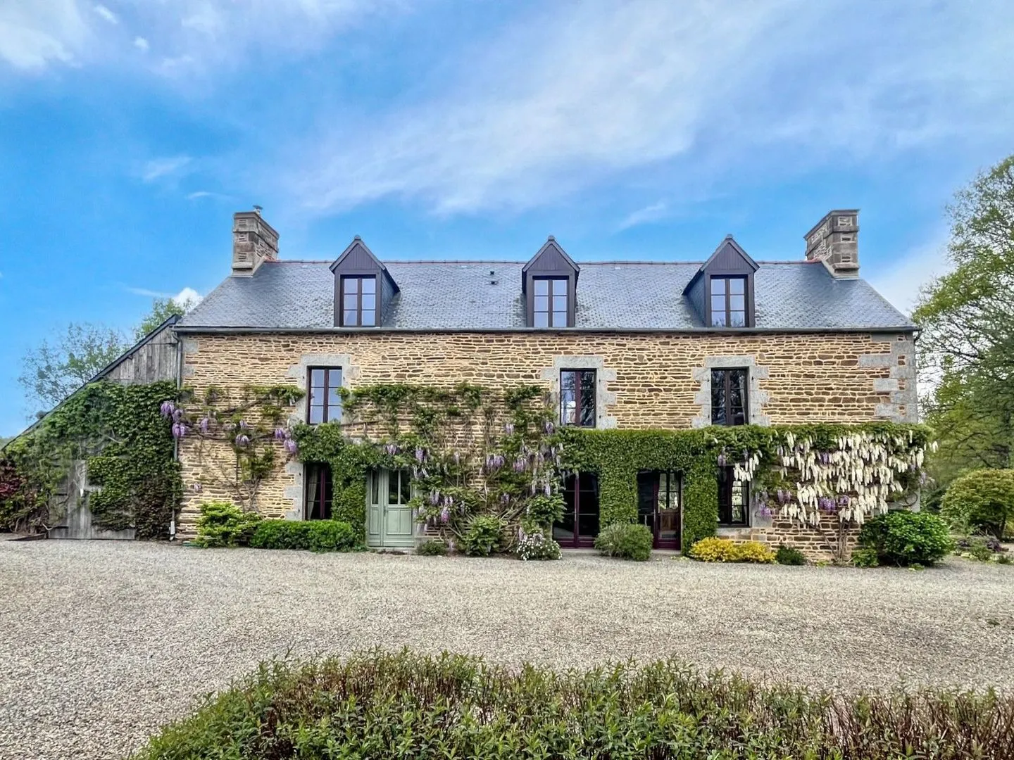 Accessed via a private drive, this elegant wisteria-clad Maison de Maître offers refined country living in one of Brittany’s most sought-after rural settings. Surrounded by approximately 7,500 m² of landscaped grounds with a private natural pond, shaded terraces and tranquil garden “rooms,” the property combines timeless French character with modern comfort — an ideal lifestyle retreat with immediate income potential.