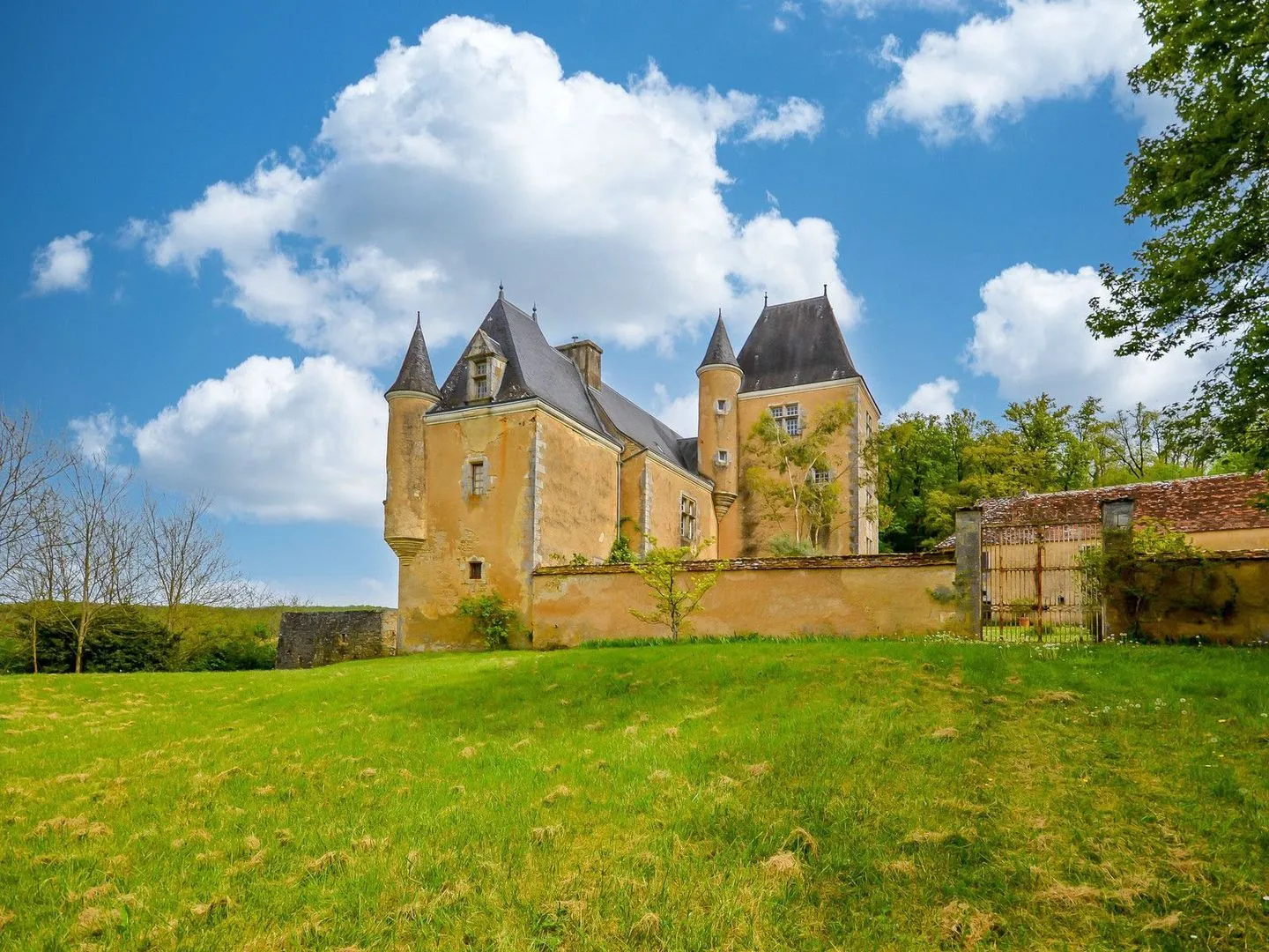 The castle is situated just beyond a hamlet that bears its name in a parish famous for its castles and has views over a valley, two other castles, an ancient riverside village (with castle), the confluence of two rivers, water meadows and forested hills.
