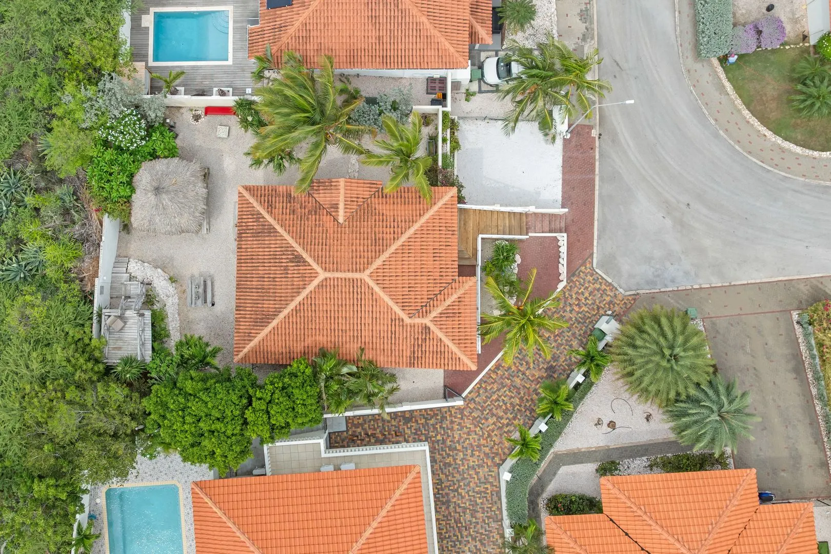 De fraaie houten trap leidt naar de voordeur. Zodra u deze opent, stroomt de passaatwind door de open leefruimte met hoge plafonds en veel natuurlijk licht. De shutterramen met aluminium en stalen frames brengen het buitenleven subtiel naar binnen. De moderne keuken, afgewerkt met een hoogwaardig Neolith-werkblad, vormt het hart van het huis en nodigt uit tot ontspannen avonden met vrienden en familie. Alles is verzorgd; de goed onderhouden staat van de woning, de details in afwerking en materiaalkeuzes.