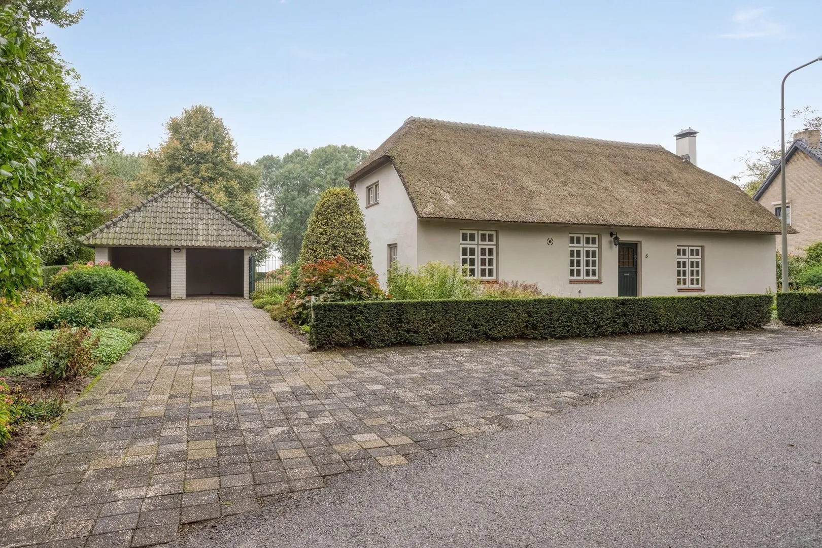 Dat aangename woongevoel begint als op het ruime erf met de immense achtertuin. Die tuin is een waar pronkstuk, ontworpen met gevoel voor sfeer en variatie. De glooiende gazons, kleurrijke borders, oude bomen, hagen en terrassen wisselen elkaar fraai af. Een sierlijke vijver, een authentieke waterput en het weidse uitzicht versterken het landelijke karakter. Daarnaast biedt de oprit plaats aan meerdere auto’s. Vervolgens leidt het tuinpad naar een groot vrijstaand bijgebouw met dubbele carport, bergzolder en aparte berging.