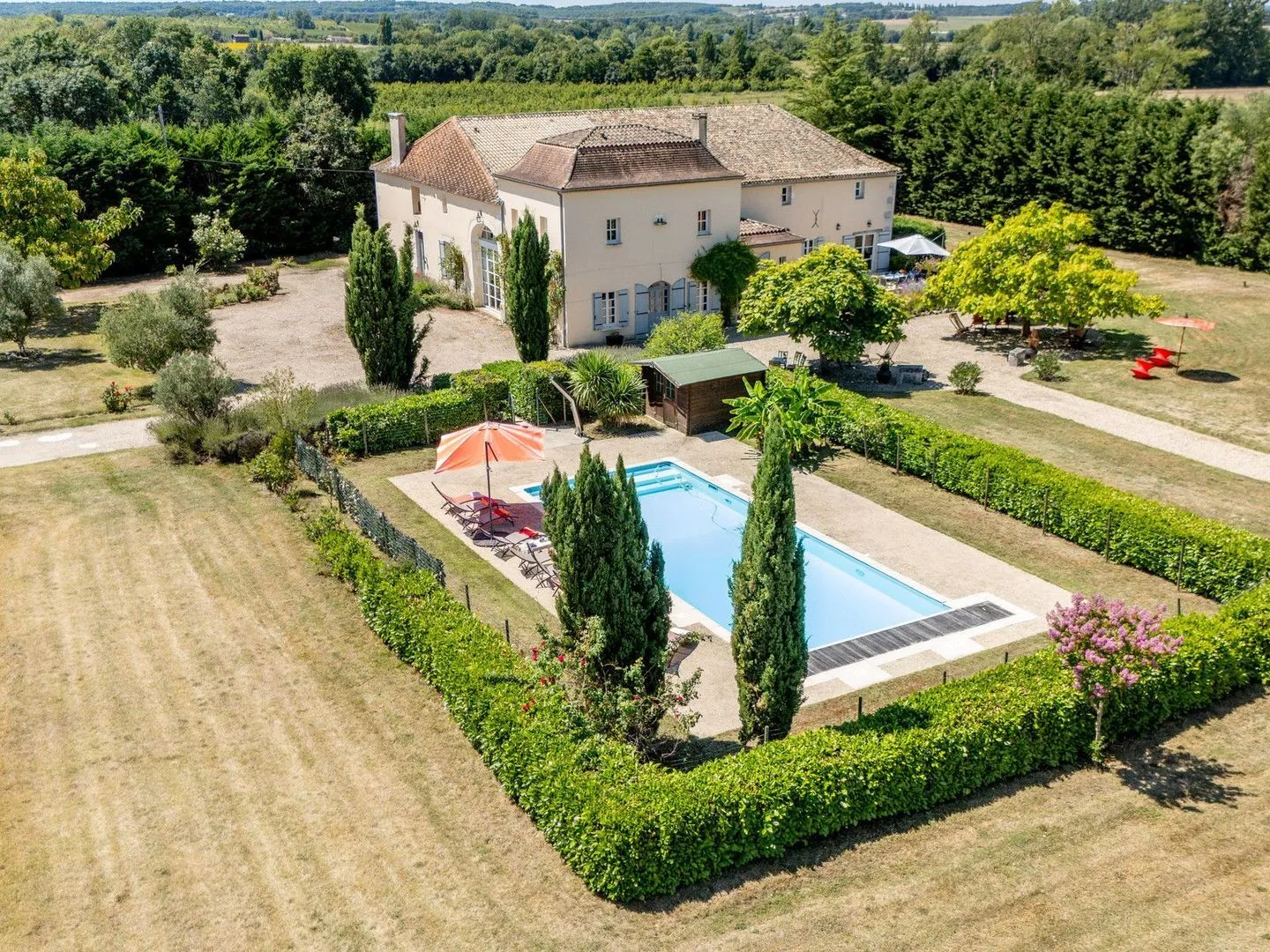 Set within 3.5 hectares of parkland bordered by woodland, this estate offers privacy and natural beauty. The area surrounding the house is thoughtfully terraced and landscaped with vibrant flowers and shady trees, creating multiple spots to relax, dine, and enjoy uninterrupted views towards the woods. A large pool with Roman steps and an outdoor shower invites both exercise and leisure.