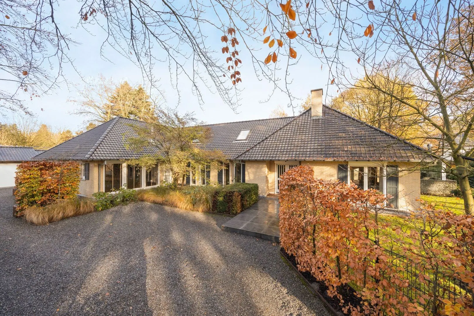 Parkeren kan in de dubbele garage of op de ruime oprit achter de poort, alles voelt hier comfortabel en verzorgd.