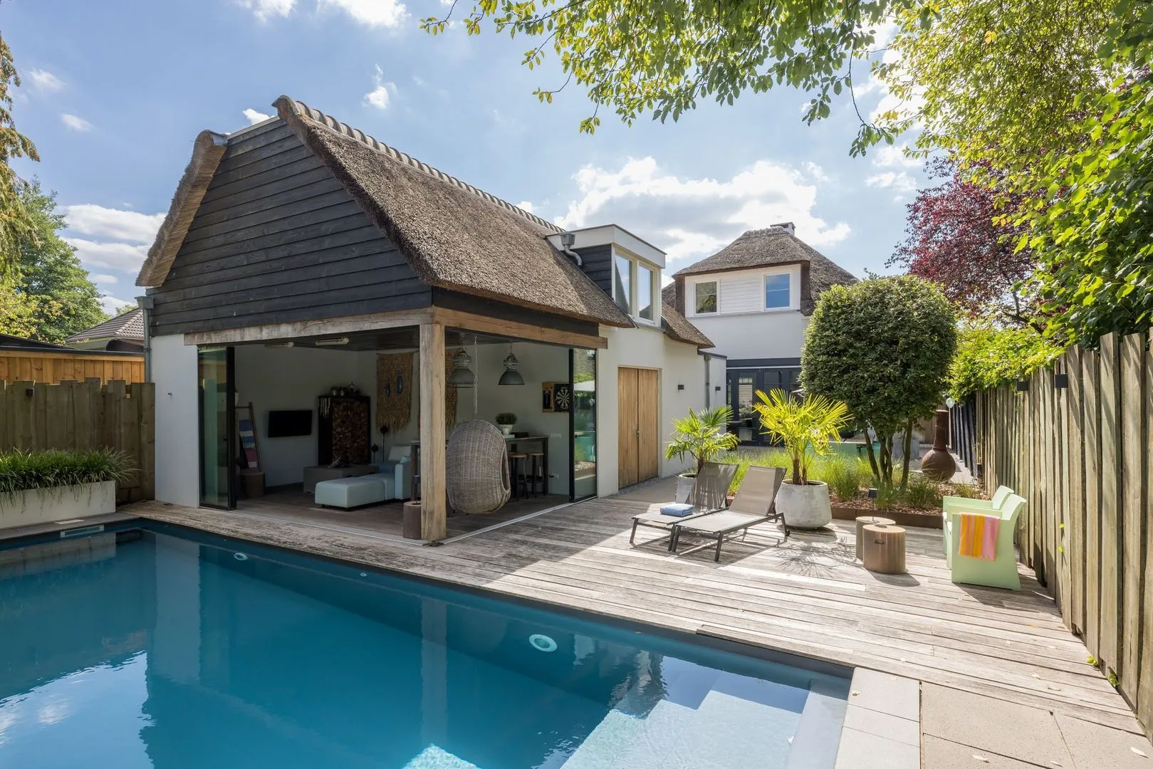 De tuin is zonder overdrijven een wereld op zich. Vol privacy, volwassen groen, meerdere terrassen en een sfeer die maar één woord verdient: paradijselijk. Het buitenzwembad en het poolhouse maken het plaatje compleet, alsof je je op een bounty-eiland bevindt. Het enige wat nog ontbreekt, is iemand die je een drankje brengt terwijl je ligt te genieten in je eigen achtertuin.