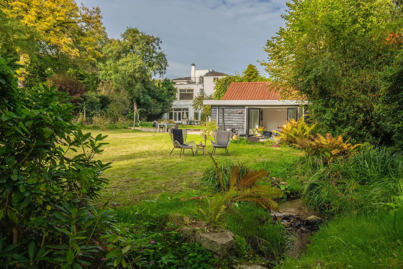 Centraal in de tuin staat een robuust, in Douglas-hout uitgevoerd bijgebouw. Deze herbergt een dubbele garage, veranda en een atelier en/of gastenverblijf met pantry en toiletruimte. De openslaande deuren naar het terras met uitzicht over de beek en monumentale bomen maken dit een inspirerende plek voor werk, gasten of hobby’s.