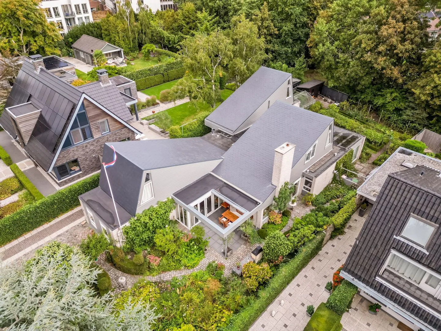 De tuin rondom de woning is rijk aan groen en zorgt voor een oase van rust en privacy. De royale oprit biedt ruimte voor meerdere auto’s op eigen terrein.