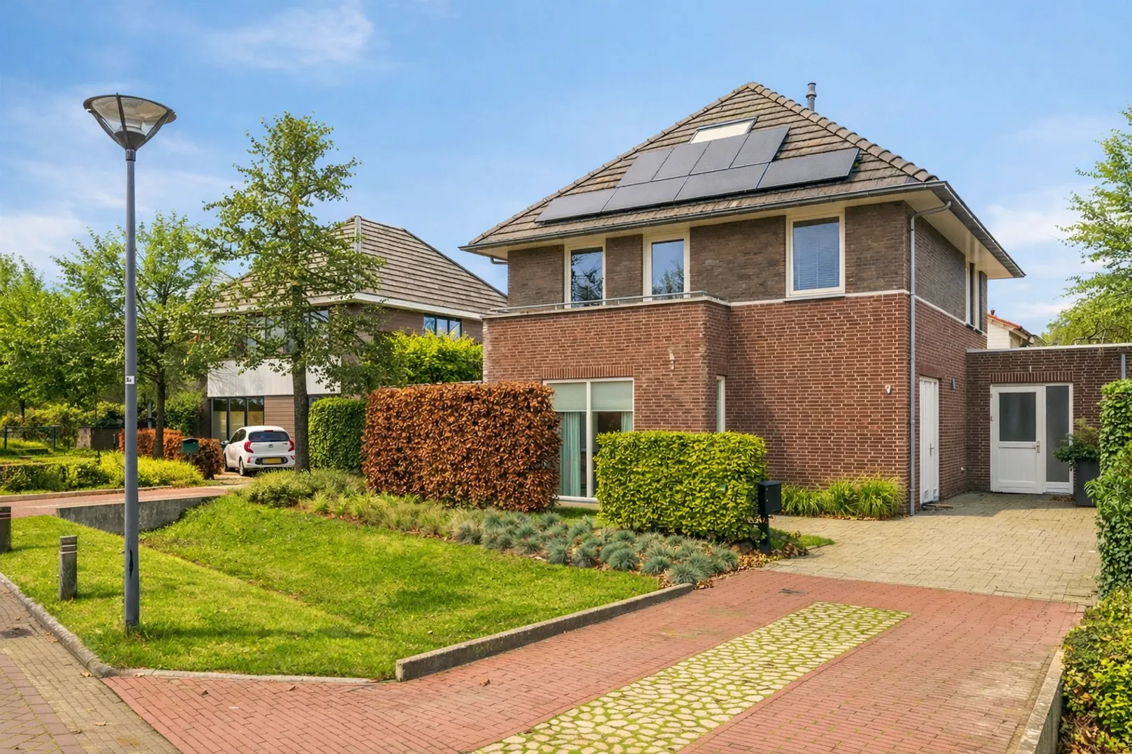 Je komt aan via de royale oprit (voorzien van laadpaal) en wordt meteen welkom geheten door een stijlvolle voordeur met extra raampartijen aan beide zijden. De ruime entree is strak afgewerkt en voorzien van nette plavuizen die doorlopen naar de woonkamer en keuken. Centraal in de hal staat een mooie houten trap. Ook het moderne toilet is vanuit de hal bereikbaar.