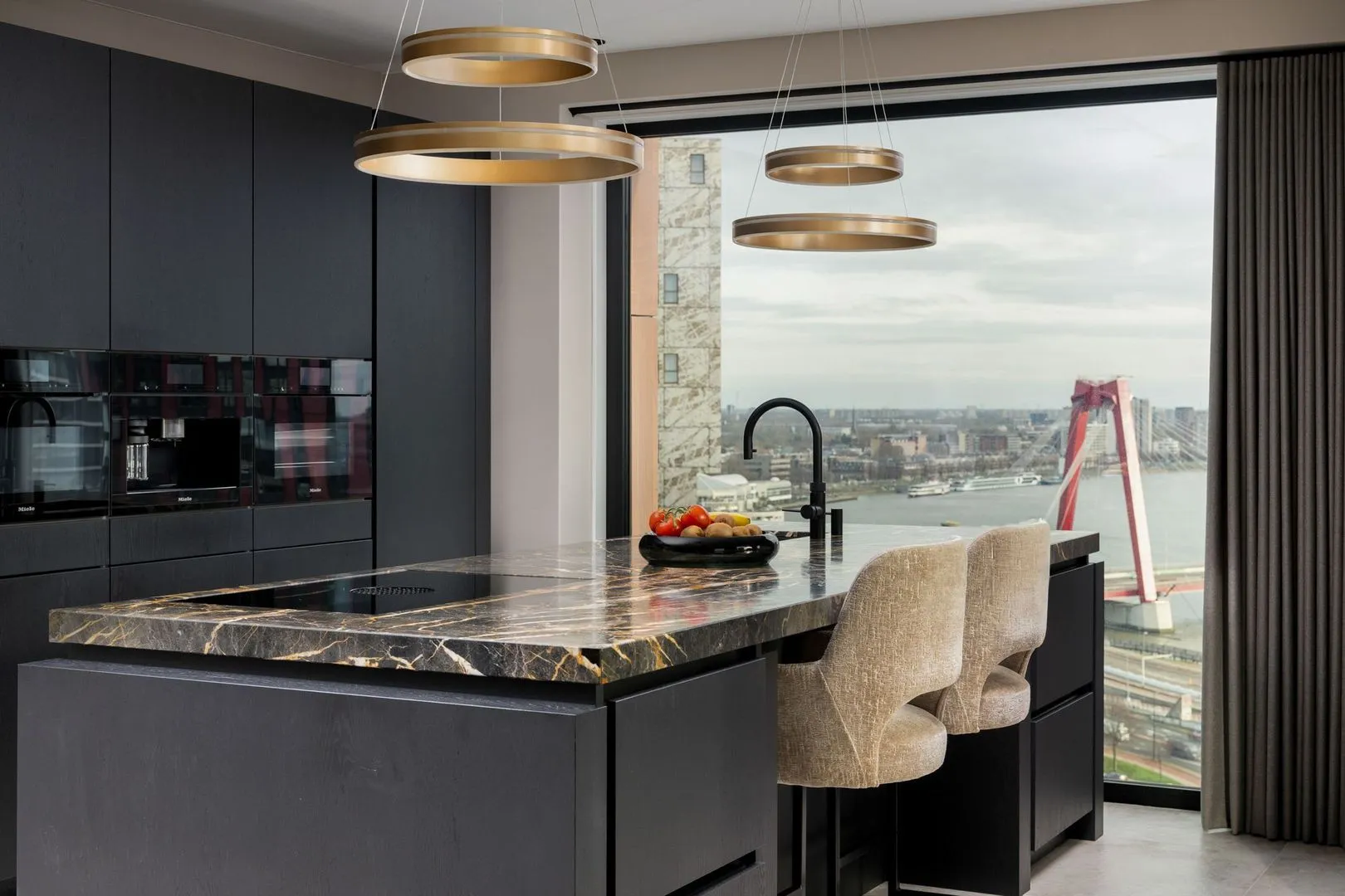 Vanuit de elegante hal heeft u toegang tot de interne berging, de 3 slaapkamers en de badkamer. Elke kamer is doordrenkt met een sfeer van rust en sereniteit, waardoor u wordt uitgenodigd om te ontspannen en tot rust te komen. Elke kamer heeft tevens een adembenemend uitzicht op de Willemsbrug, Kralingse Plas, de Maas en meer..