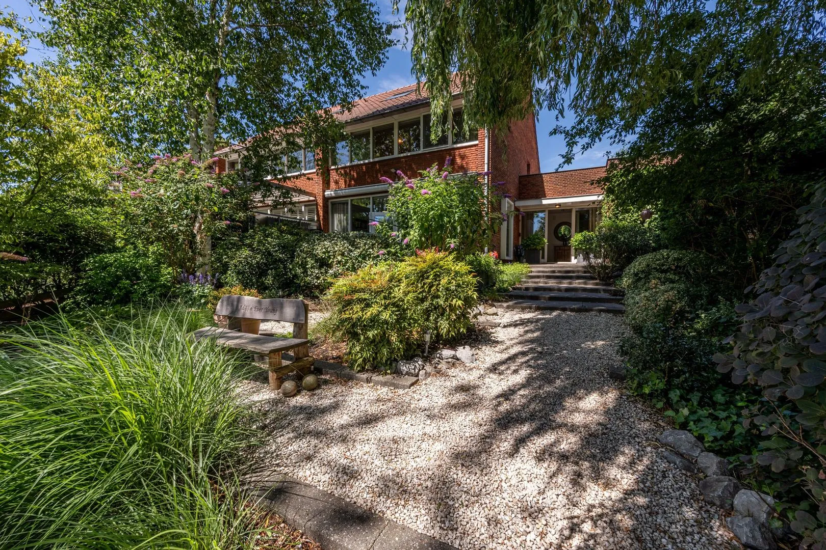 Wat deze woning extra bijzonder maakt, is de fijne buitenruimte rondom het huis. Aan de voor- en zijkant ligt een verrassend ruime tuin met veel privacy dankzij de volwassen beplanting. Hier geniet je van een groene oase, compleet met vijver, meerdere terrassen en volop zon- en schaduwplekken.