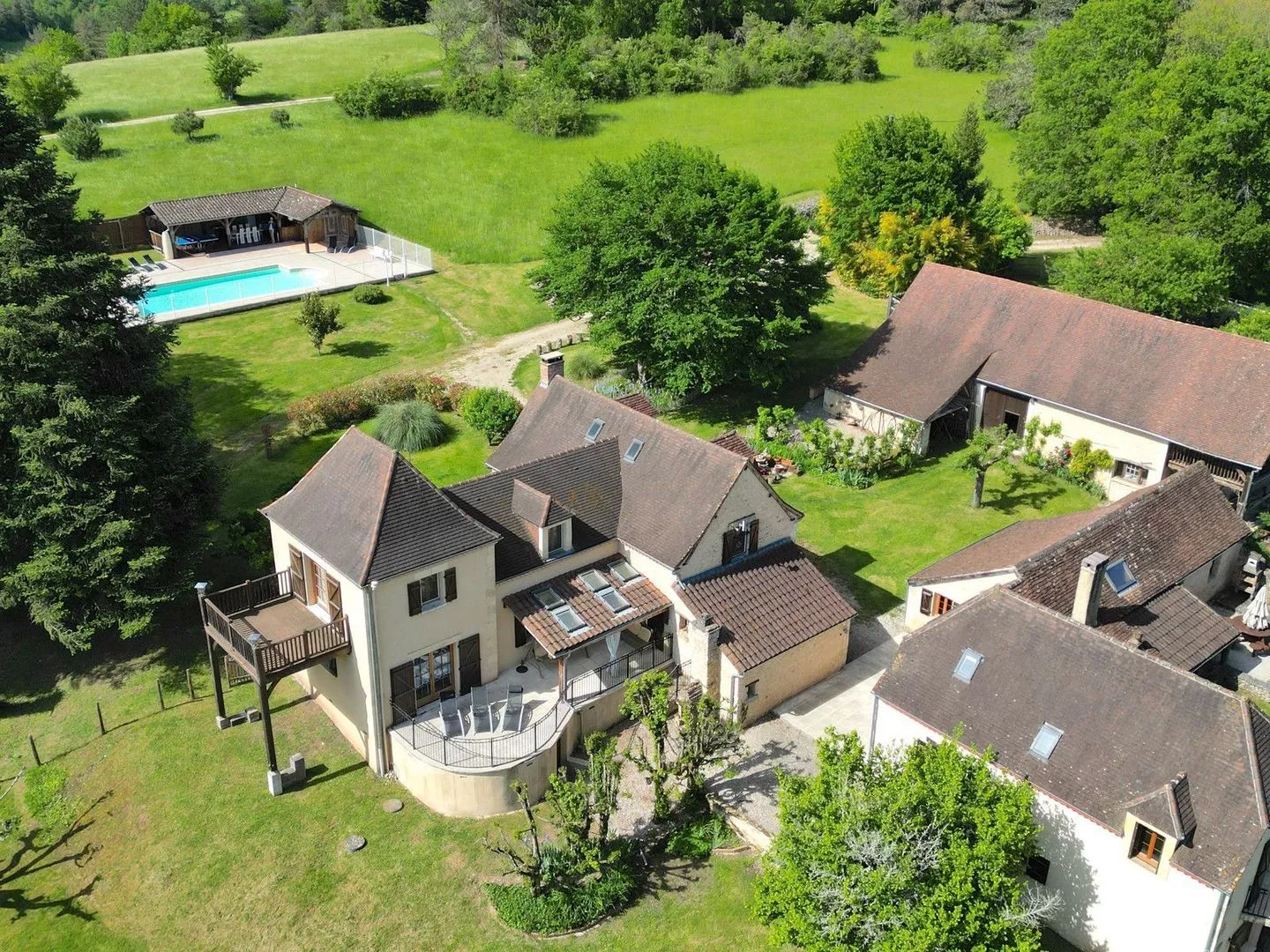 In addition to the main house, this property includes a charming gîte (renovated) with five bedrooms and three bathrooms. The open living space, complete with an inviting kitchen and covered porch, provides a perfect setting for guests or can serve as a lucrative rental opportunity.