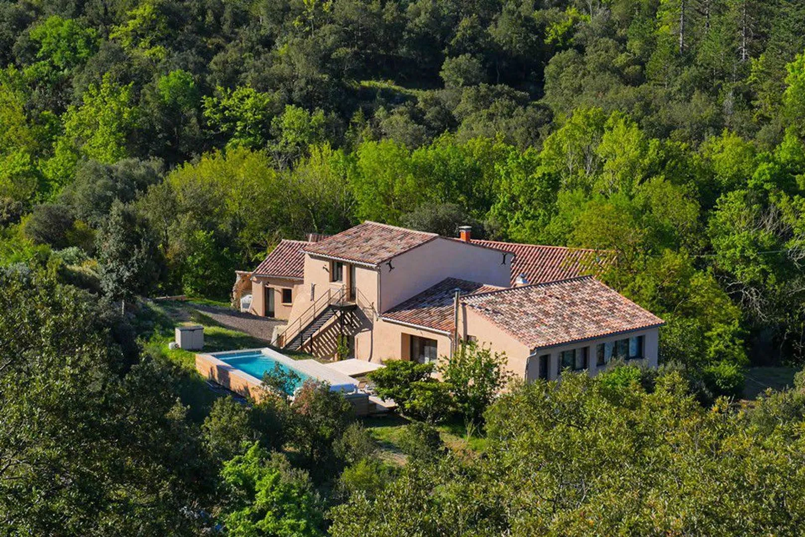 Set in a wild and unspoilt valley of the Aude Pyrenean foothills, between Limoux and Carcassonne, this exceptional eco-self-sufficient estate enjoys a truly rare setting at around 300 metres altitude. Accessed via a well-maintained forest track, the property offers total peace, privacy and immersion in nature. It is located just minutes from a village, 20 minutes from Limoux, 25 minutes from Carcassonne and its airport, 1h15 from the Mediterranean coast and 1h20 from Toulouse airport.
