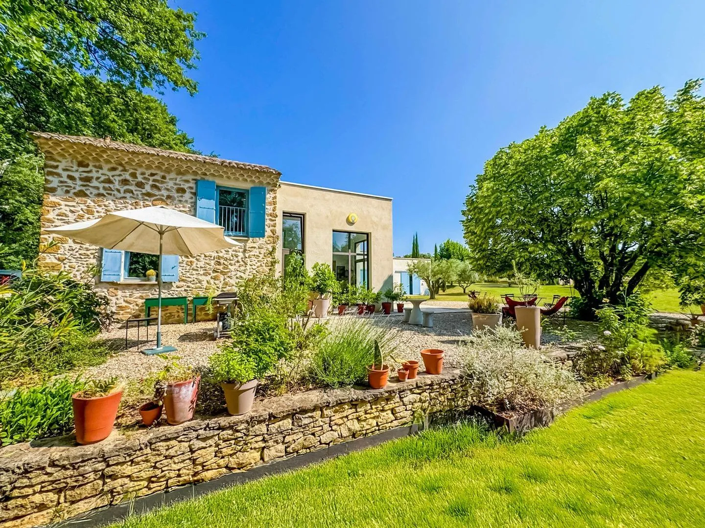 Designed to maximize its south-facing exposure, the house enjoys exceptional sunlight while also providing shaded, cool areas for optimal comfort in all seasons. Natural light floods every room thanks to large sliding glass doors and carefully selected barn doors. Each room opens easily onto the garden, inviting seamless indoor-outdoor living.