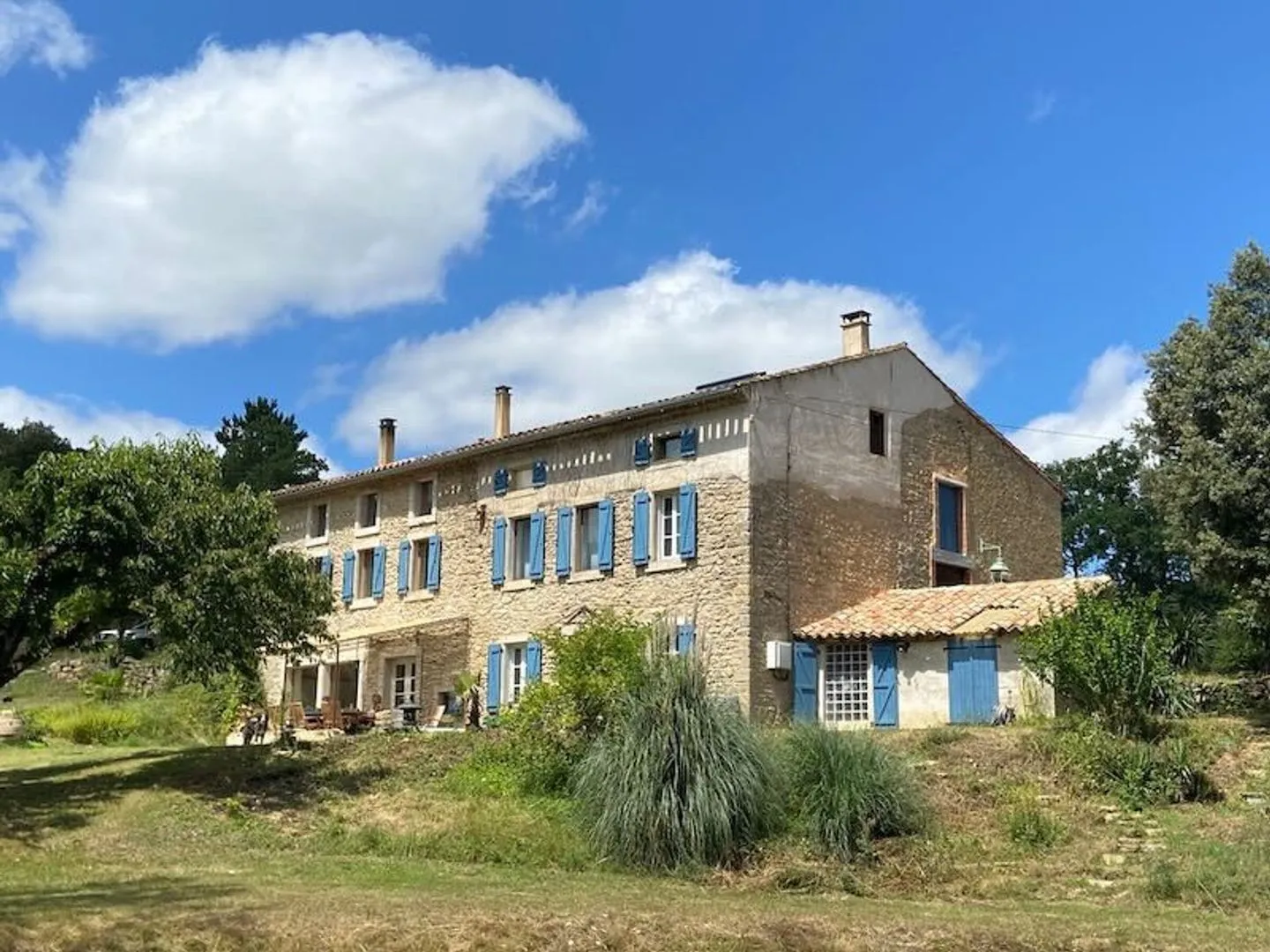 Natural stone Mas dating from before 1900, completely renovated and well insulated, with views of the surrounding rolling hills. Set in its own grounds of 2.2 hectares, with 253 m2 of living space over 3 levels. Adjoining 2-storey bergerie with a surface of 163 m2 plus smaller outbuildings with an additional surface area of in total 57 m2.