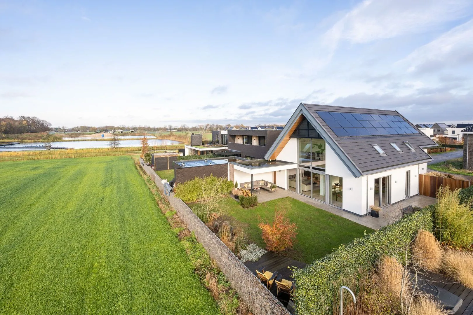 De tuin rondom de woning is met zorg aangelegd en sluit perfect aan op de architectuur van het huis. Aan de achterzijde geniet je van een weids, vrij uitzicht over de groene velden, een kwaliteit die in de wijk zeldzaam is. De grote raampartijen en schuifpuien verbinden binnen en buiten op een natuurlijke manier, waardoor het uitzicht in elk seizoen onderdeel wordt van de leefruimte.