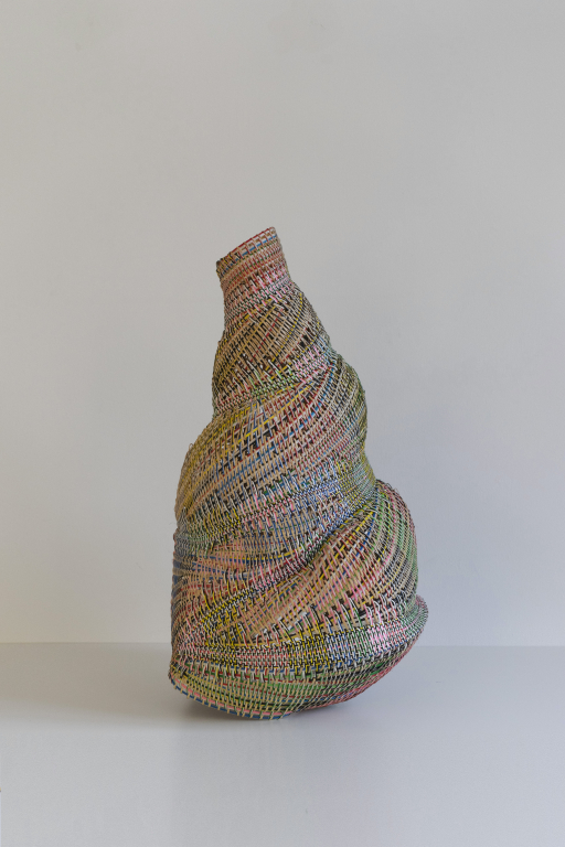 Ambacht en handwerk vieren hoogtij. Dienke Dekker bestudeert traditionele textielambachten en weeftechnieken en experimenteert met verschillende materialen, zoals geverfd papier, rotan en katoen. Hiermee weeft ze eerst losse onderdelen om deze daarna met elkaar te verweven. De objecten tonen vormen en structuren die direct voorkomen uit de gebruikte technieken.