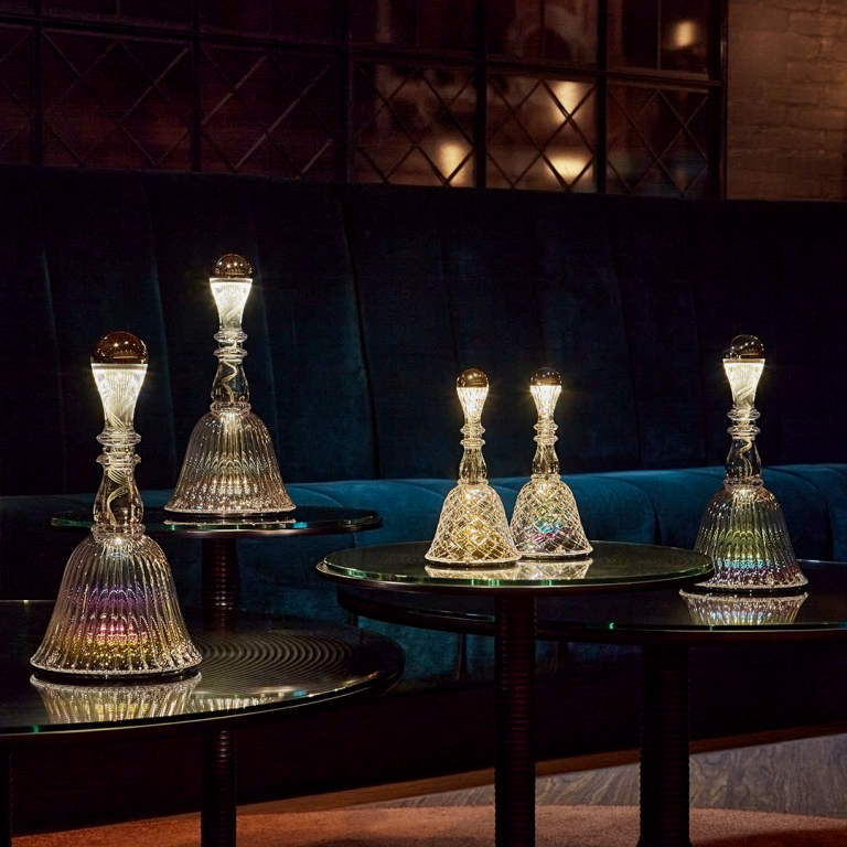 De klokvormige, oplaadbare tafellamp Bella van Marcel Wanders voor Ramun combineert licht met muziek. Raak de top aan en luister naar tien verschillende klassieke melodieën; van Bach, Chopin en Puccini tot Happy Birthday. De Bella plissé lamp is er nu ook in een kleiner model: 9 cm in doorsnede en 18 cm hoog.