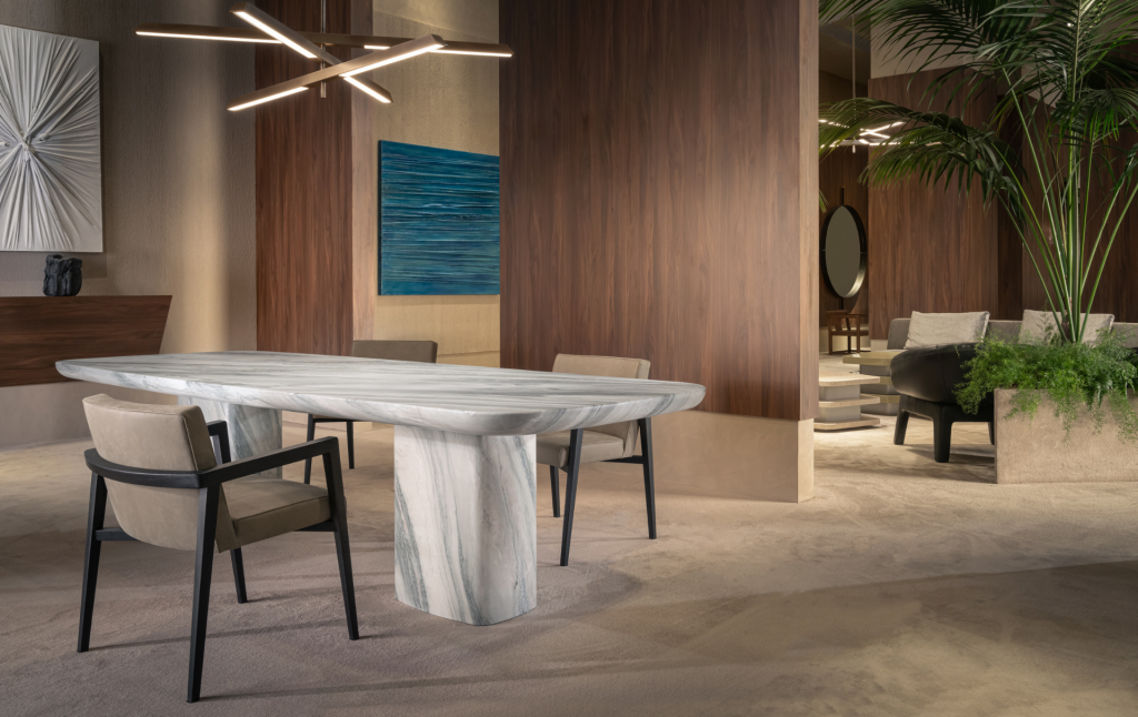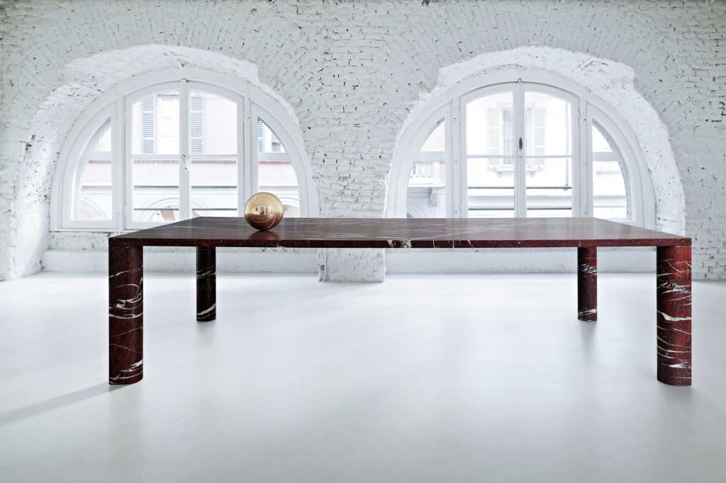 De ronde eettafel Odette van Lithos Design is volledig gemaakt van marmer. De poot is geïnspireerd op de klassieke zuilen met een subtiele versmalling om de rigiditeit van een puur cilindrische vorm te voorkomen. Het geeft de tafel ook iets vrouwelijks. De tafel is 75 cm hoog en 140 cm in doorsnede en verkrijgbaar in Arabescato Vagli (wit marmer) en Nero Marquinia (zwart marmer). Zie foto boven | www.lithosdesign.com